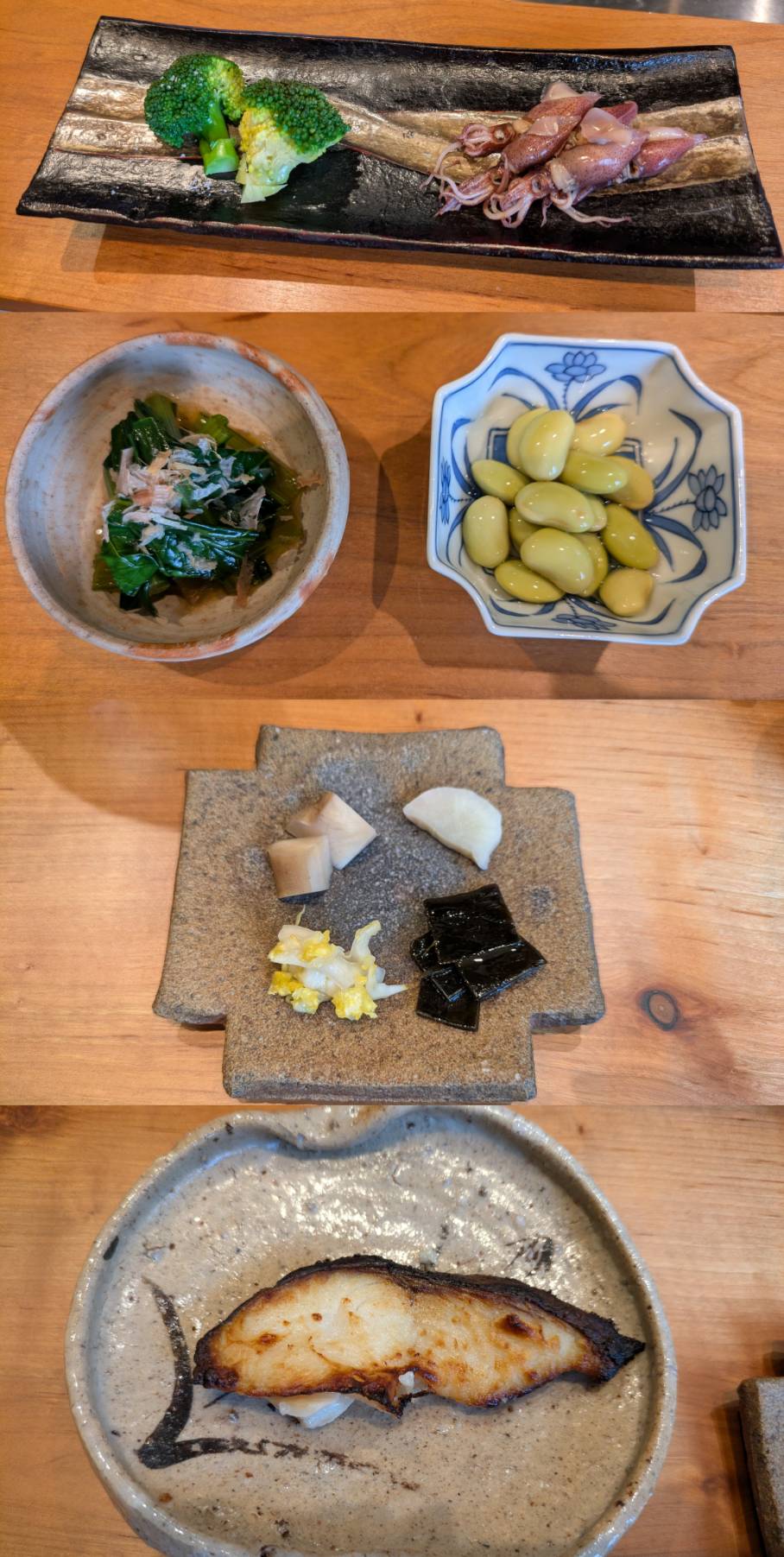 お店で漬けている昆布やわんぱく卵の出し巻き、産地直送野菜のお豆さん(秘伝豆)などの季節の料理、メインの魚料理は鮭か鱈のどちらかを選ばせてもらい、私は鮭をいただきました。